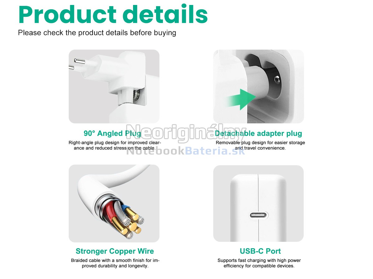 NotebookBateria.sk je profesionálny distribútor adaptérov, ktorý kombinuje výskum, výrobu a predaj. Tento úplne nový náhradný adaptér pre Apple 30W USB-C je vyrobený z vysokokvalitných komponentov, originálneho obvodového dizajnu a tepelne odolného materiálu PC/ABS. Vďaka precíznemu spracovaniu ponúka adaptér dlhú životnosť a stabilný výkon.