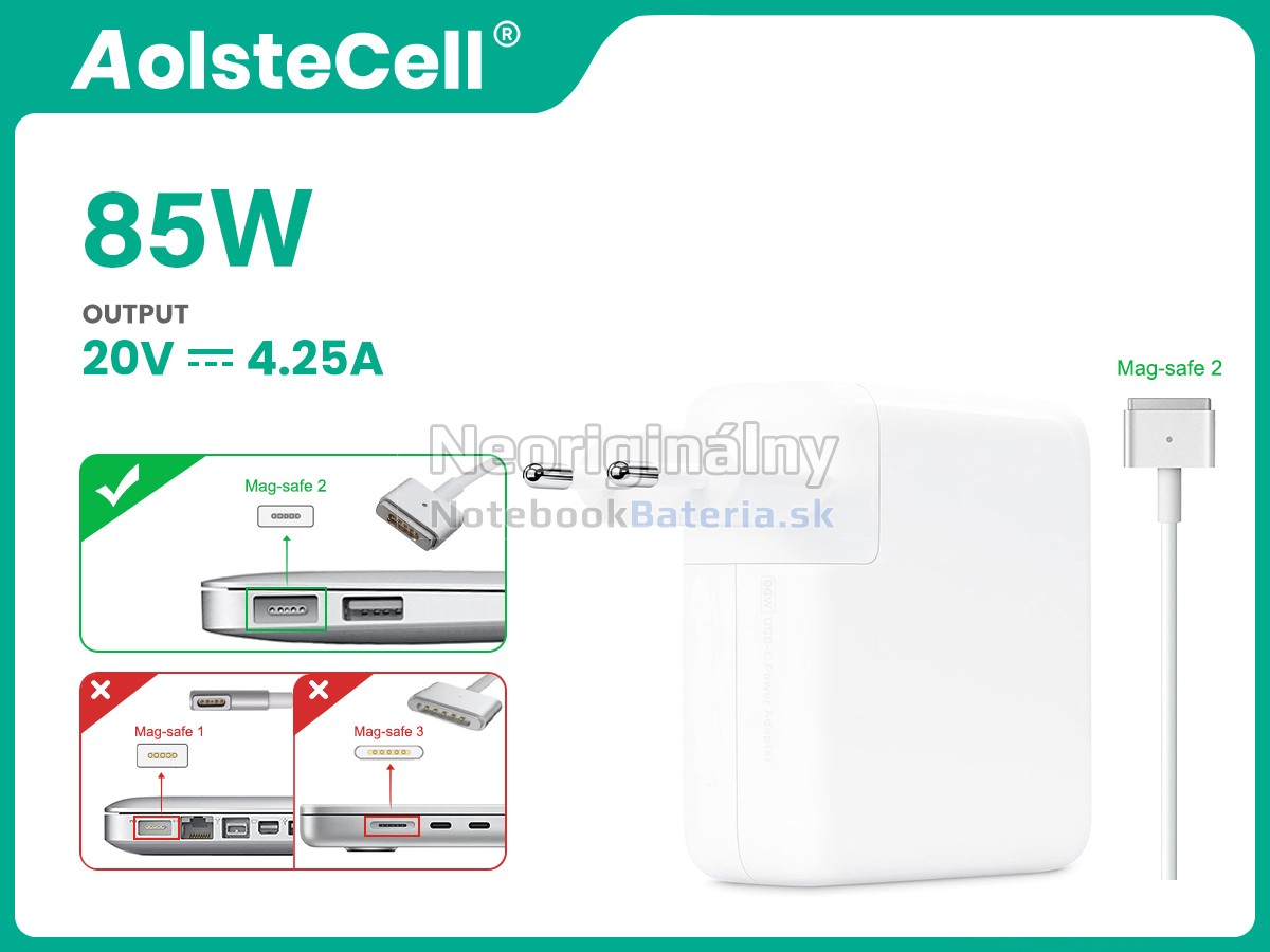 Každý adaptér Apple 85W MagSafe 2 predávaný na NotebookBateria.sk prešiel prísnymi testami a získal certifikáty ako EVPU, CE, GS, RoHS a ISO9001:2015. Okrem 100% kompatibility obsahuje pokročilé ochranné funkcie proti preťaženiu, skratu a prehrievaniu pre maximálnu bezpečnosť. Pred odoslaním sa každý adaptér dôkladne testuje, aby sme zabezpečili, že spĺňa všetky špecifikácie. Vyberte si kvalitu, na ktorú sa môžete spoľahnúť!