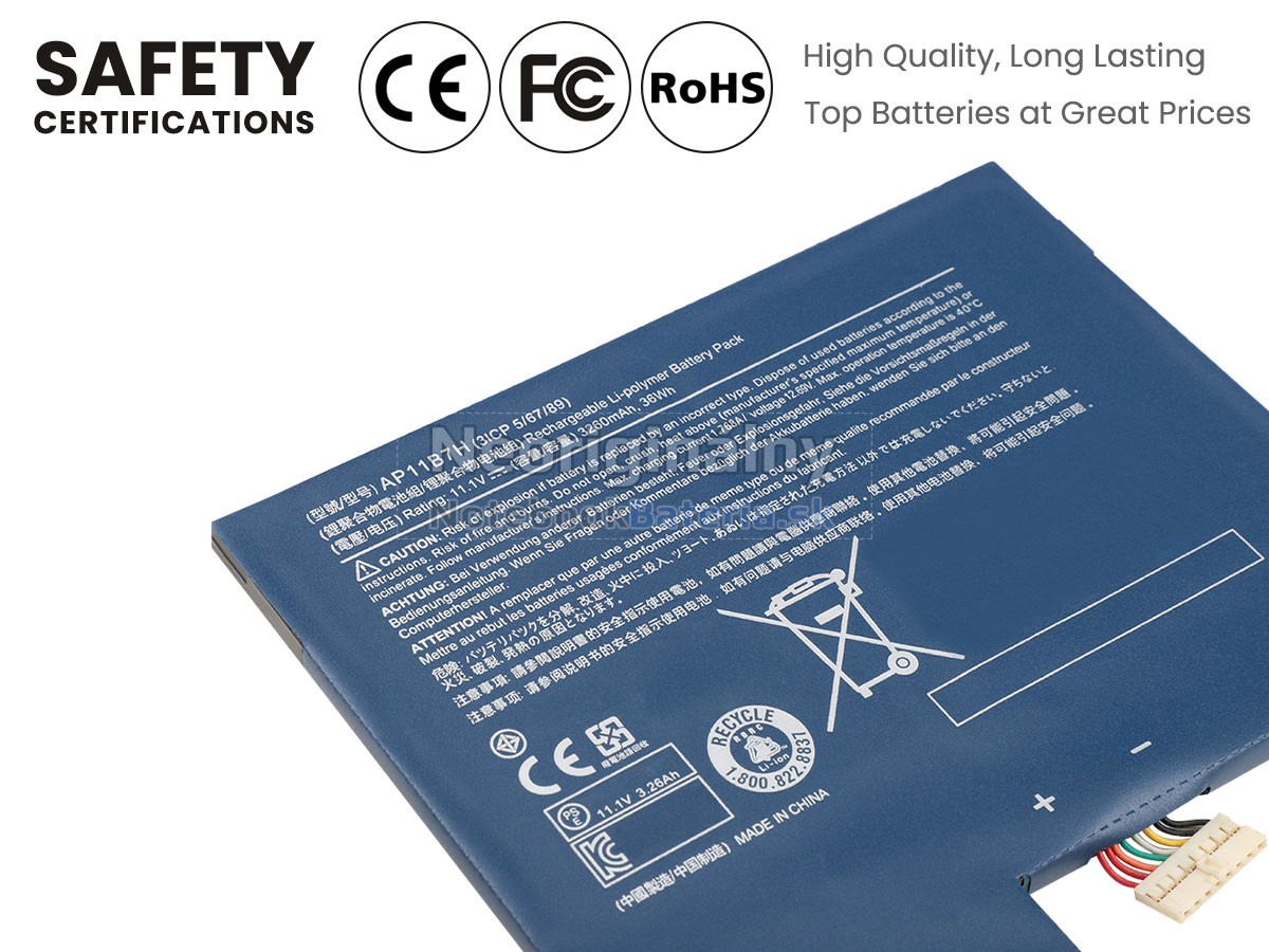 Každá z našich batérií pre notebooky Acer BT.00303.024 prešla certifikátmi EVPU, CE, GS, RoHS, ISO9001:2015 a ďalšími. Okrem toho, že sú plne kompatibilné, majú tiež inteligentné ochranné opatrenia proti preťaženiu, nadmernému vypúšťaniu a prehrievaniu kvôli väčšej bezpečnosti. Okrem toho je každá náhradná batérie Acer BT.00303.024 pred odchodom z továrne podrobená sérii testov. Na predaj sú povolené iba výrobky, ktoré spĺňajú špecifikácie.