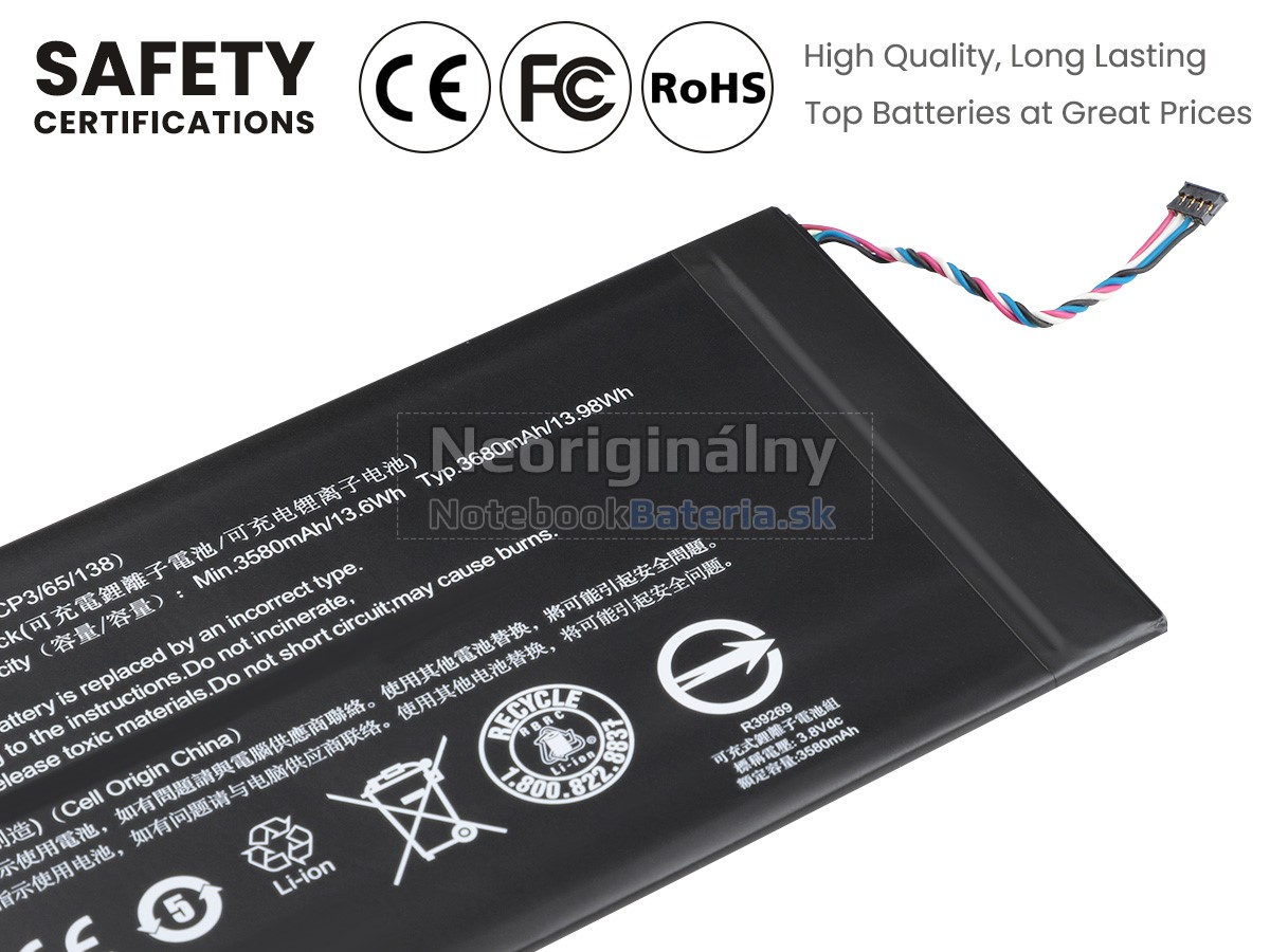 Každá z našich batérií pre notebooky Acer MLP2964137 prešla certifikátmi EVPU, CE, GS, RoHS, ISO9001:2015 a ďalšími. Okrem toho, že sú plne kompatibilné, majú tiež inteligentné ochranné opatrenia proti preťaženiu, nadmernému vypúšťaniu a prehrievaniu kvôli väčšej bezpečnosti. Okrem toho je každá náhradná batérie Acer MLP2964137 pred odchodom z továrne podrobená sérii testov. Na predaj sú povolené iba výrobky, ktoré spĺňajú špecifikácie.