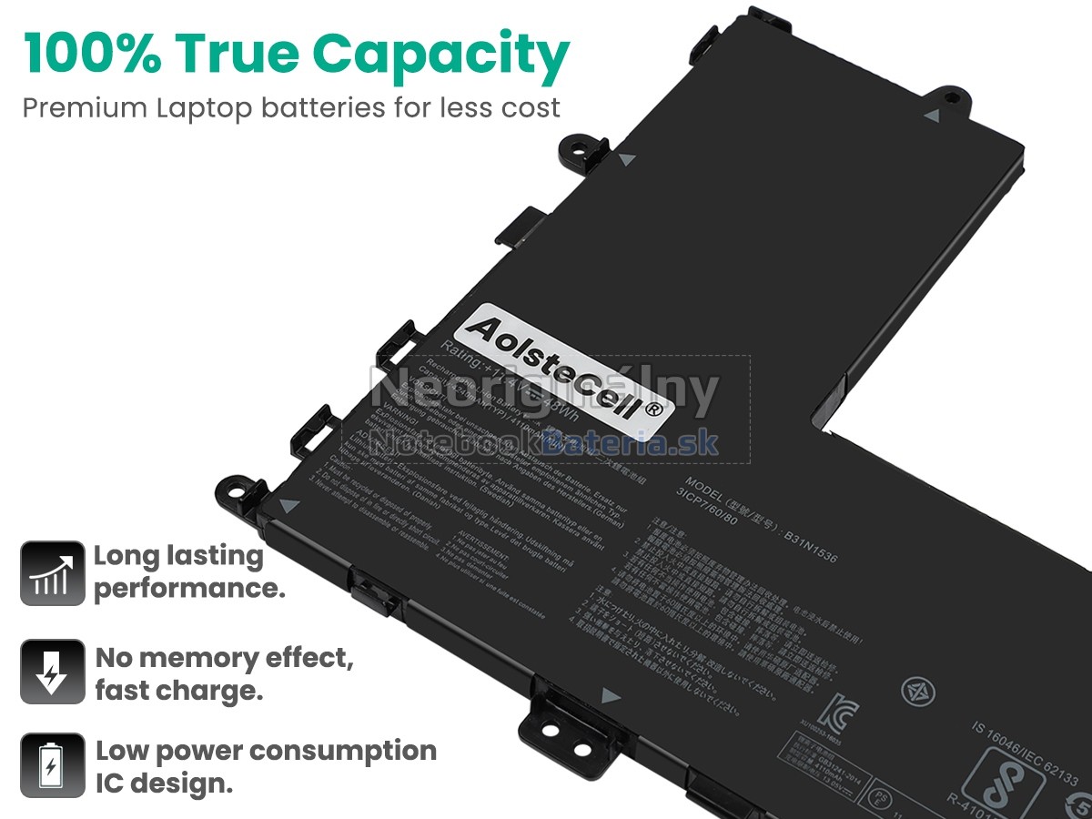 Každá z našich batérií pre notebooky Asus B31N1536 prešla certifikátmi EVPU, CE, GS, RoHS, ISO9001:2015 a ďalšími. Okrem toho, že sú plne kompatibilné, majú tiež inteligentné ochranné opatrenia proti preťaženiu, nadmernému vypúšťaniu a prehrievaniu kvôli väčšej bezpečnosti. Okrem toho je každá náhradná batérie Asus B31N1536 pred odchodom z továrne podrobená sérii testov. Na predaj sú povolené iba výrobky, ktoré spĺňajú špecifikácie.
