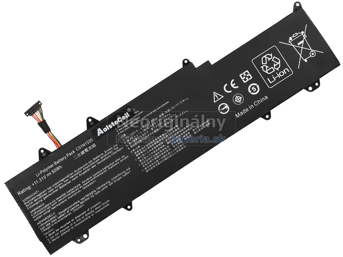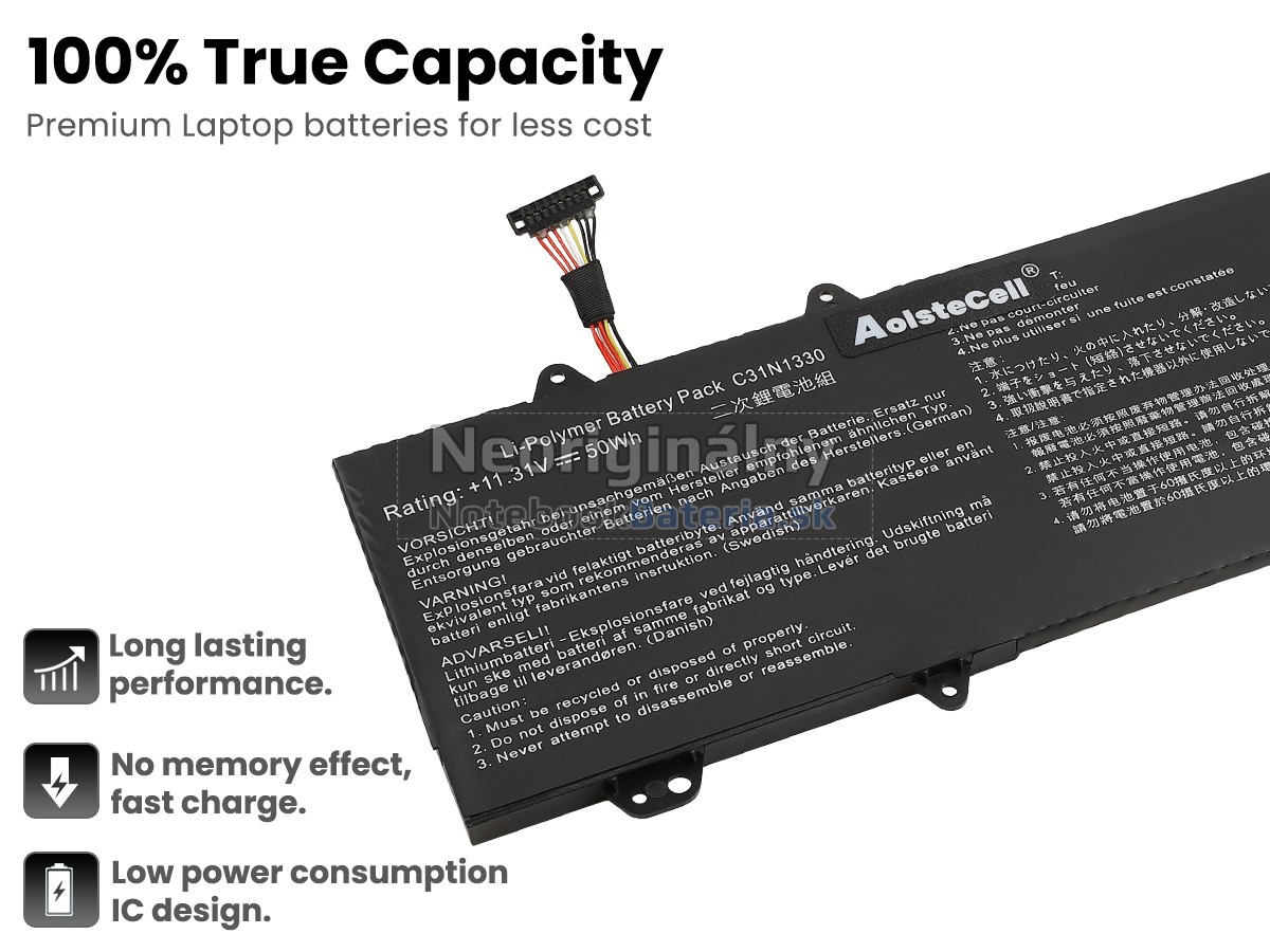 V súčasnosti nemajú lítium-iónové batérie žiadny pamäťový efekt. Preto pri prvom použití nemusíte nabíjať novú batériu C31N1330 po dobu 12 hodín alebo viac. Môže sa úplne nabiť, keď je úroveň batérie plná. Ak je prenosný počítač pripojený k externému napájaniu, batérie sa po úplnom nabití zastaví a vyloží a prenosný počítač naďalej pracuje s externým napájaním.