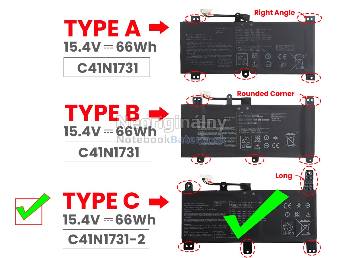 Before placing an order please open your laptop to check your old battery first, ensure order one right battery for your laptop, since there are 3 types batteries. This battery is only fit for ROG Strix G512LU, G512LV, G512LW, G512LWS, G531GU, G531GV, G531GW, G532LV, G532LW, G532LWS, G712LU, G712LV, G712LW, G712LWS, G731GU, G731GV, G731GW, G732LV, G732LW, G732LWS, G732LXS.