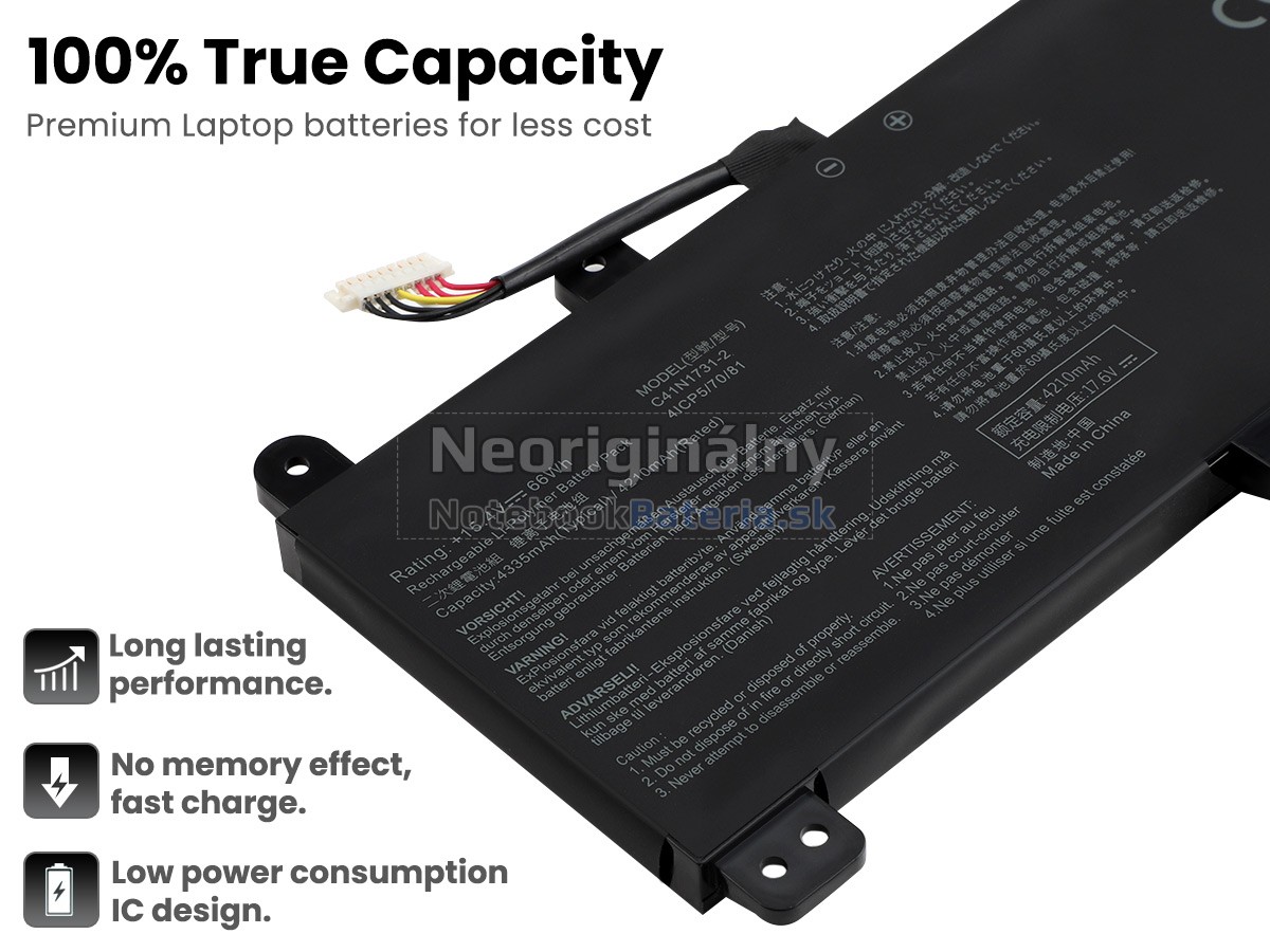 NotebookBateria.sk je profesionálny distribútor batérie, ktorý integruje výskum a vývoj, výrobu a predaj. Táto úplne nová náhradná batéria pre Asus Rog STRIX G17 G712LV je vyrobená z vysoko kvalitných článkov triedy A+, originálneho dizajnu obvodu a krytu PC / ABS odolného voči vysokej teplote. Zabezpečením kvality sa výdrž batérie výrazne zlepšila.
