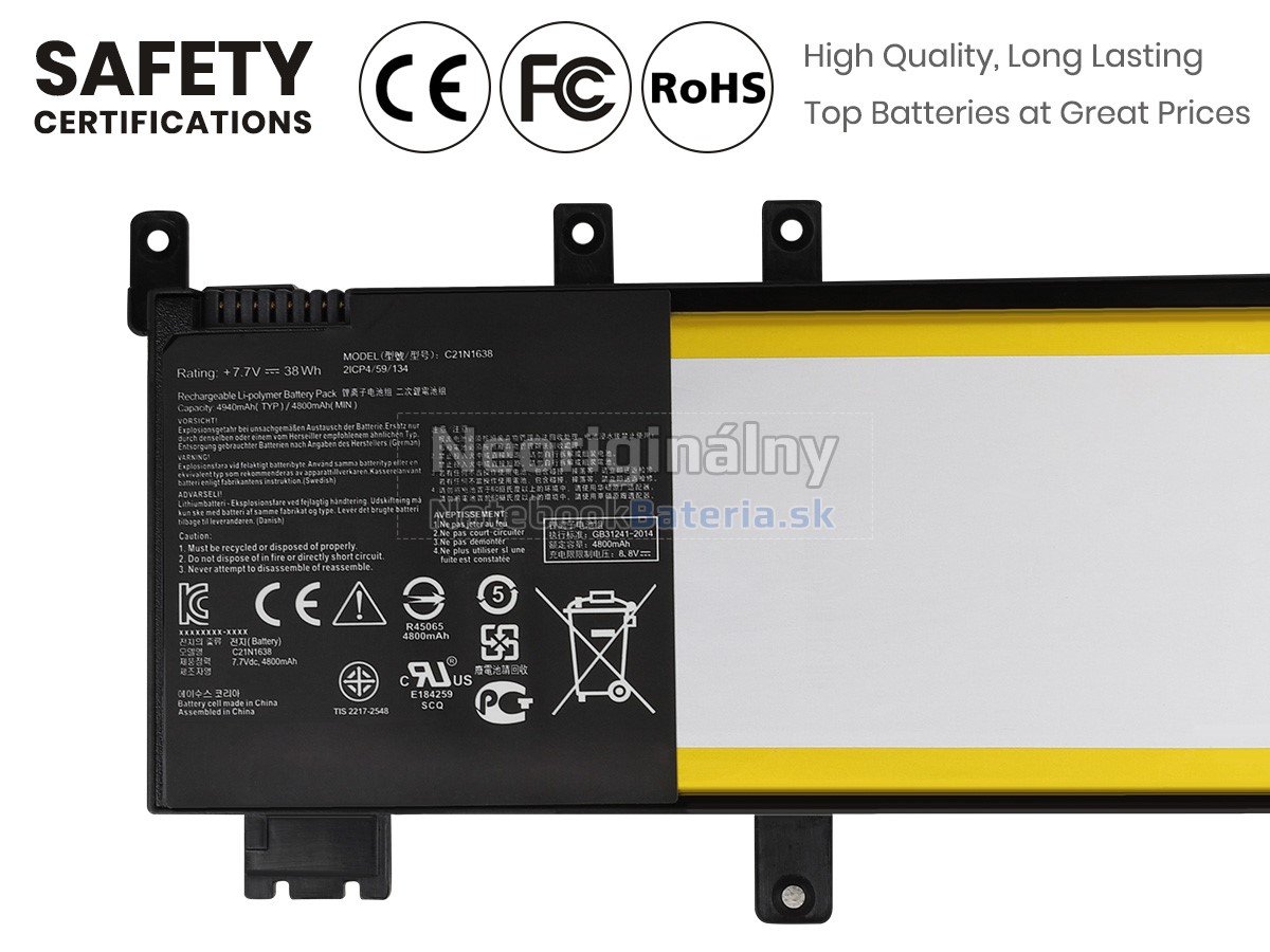 Každá z našich batérií pre notebooky Asus ZenBook X442UR prešla certifikátmi EVPU, CE, GS, RoHS, ISO9001:2015 a ďalšími. Okrem toho, že sú plne kompatibilné, majú tiež inteligentné ochranné opatrenia proti preťaženiu, nadmernému vypúšťaniu a prehrievaniu kvôli väčšej bezpečnosti. Okrem toho je každá náhradná batérie Asus ZenBook X442UR pred odchodom z továrne podrobená sérii testov. Na predaj sú povolené iba výrobky, ktoré spĺňajú špecifikácie.