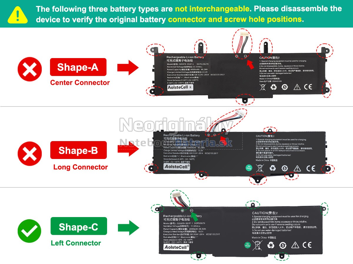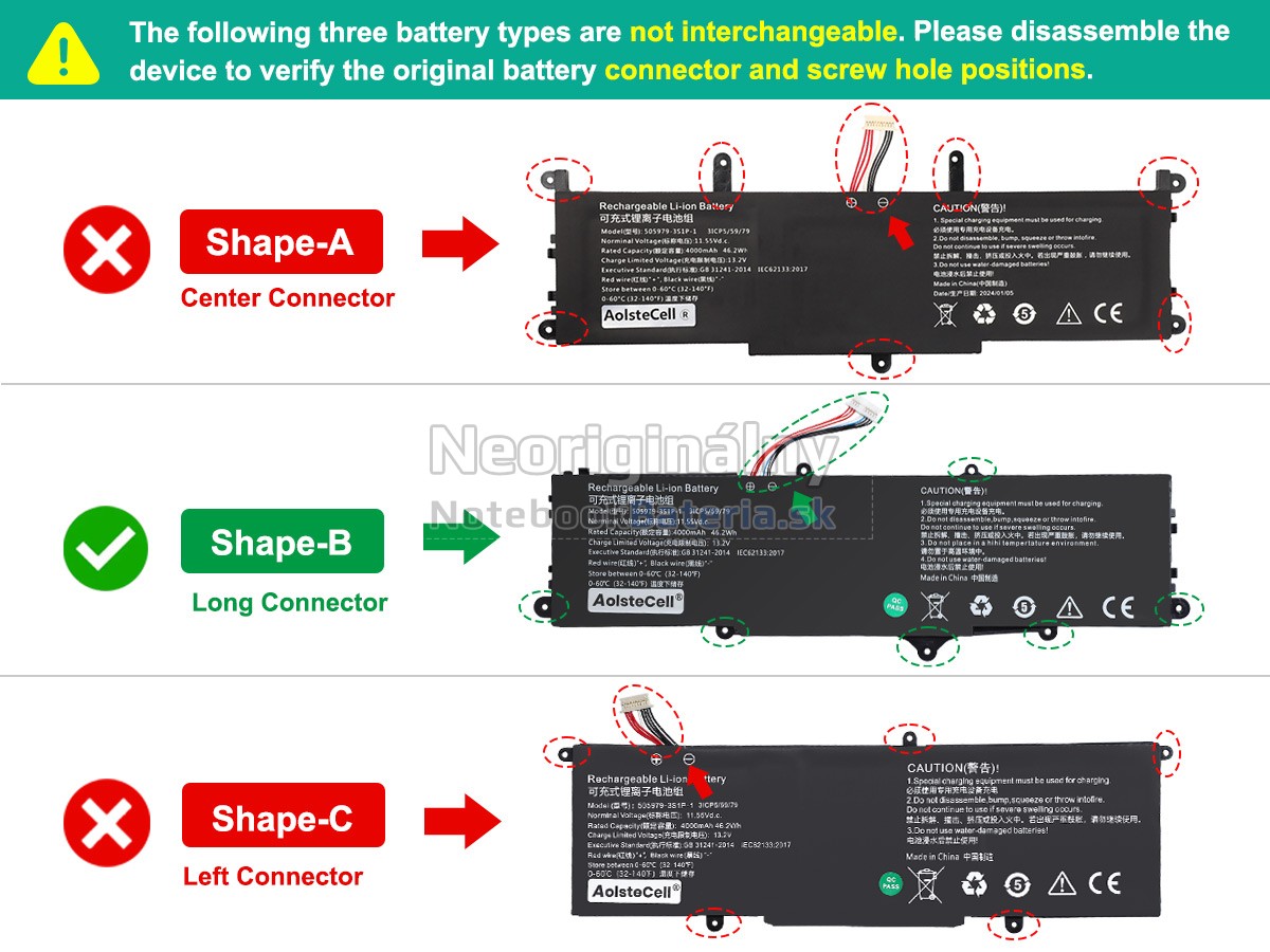 Každá z našich batérií pre notebooky CHUWI 505979-3S1P-1 prešla certifikátmi EVPU, CE, GS, RoHS, ISO9001:2015 a ďalšími. Okrem toho, že sú plne kompatibilné, majú tiež inteligentné ochranné opatrenia proti preťaženiu, nadmernému vypúšťaniu a prehrievaniu kvôli väčšej bezpečnosti. Okrem toho je každá náhradná batérie CHUWI 505979-3S1P-1 pred odchodom z továrne podrobená sérii testov. Na predaj sú povolené iba výrobky, ktoré spĺňajú špecifikácie.