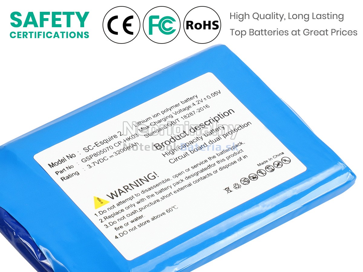 Každá z našich batérií pre reproduktor Harman Kardon ESQUIRE2 prešla certifikátmi EVPU, CE, GS, RoHS, ISO9001:2015 a ďalšími. Okrem toho, že sú plne kompatibilné, majú tiež inteligentné ochranné opatrenia proti preťaženiu, nadmernému vypúšťaniu a prehrievaniu kvôli väčšej bezpečnosti. Okrem toho je každá náhradná batérie Harman Kardon ESQUIRE2 pred odchodom z továrne podrobená sérii testov. Na predaj sú povolené iba výrobky, ktoré spĺňajú špecifikácie.