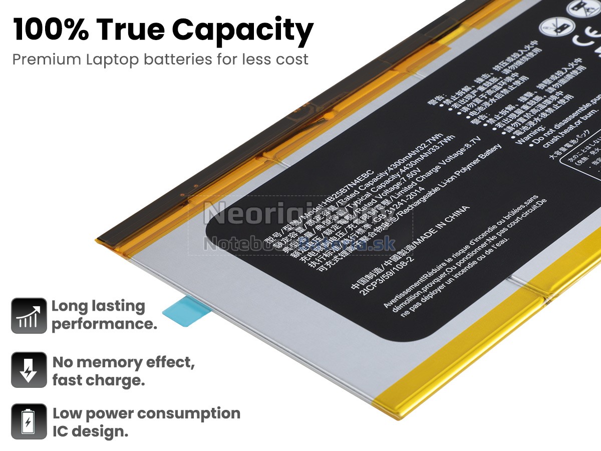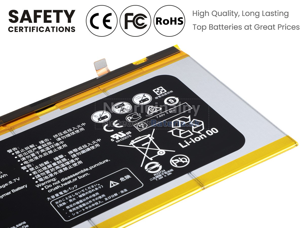 Každá z našich batérií pre notebooky Huawei HZ-W19 prešla certifikátmi EVPU, CE, GS, RoHS, ISO9001:2015 a ďalšími. Okrem toho, že sú plne kompatibilné, majú tiež inteligentné ochranné opatrenia proti preťaženiu, nadmernému vypúšťaniu a prehrievaniu kvôli väčšej bezpečnosti. Okrem toho je každá náhradná batérie Huawei HZ-W19 pred odchodom z továrne podrobená sérii testov. Na predaj sú povolené iba výrobky, ktoré spĺňajú špecifikácie.