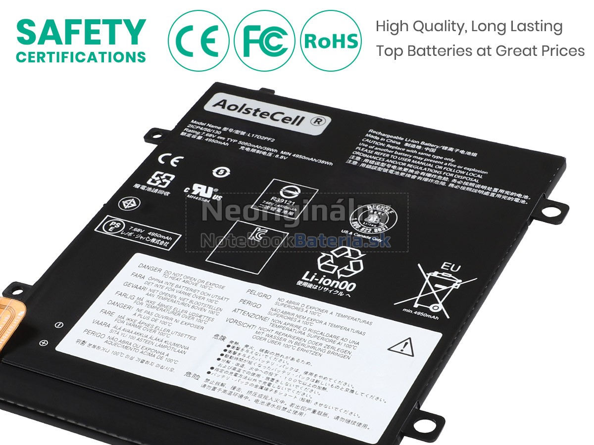 Každá z našich batérií pre notebooky Lenovo L17M2PF3 prešla certifikátmi EVPU, CE, GS, RoHS, ISO9001:2015 a ďalšími. Okrem toho, že sú plne kompatibilné, majú tiež inteligentné ochranné opatrenia proti preťaženiu, nadmernému vypúšťaniu a prehrievaniu kvôli väčšej bezpečnosti. Okrem toho je každá náhradná batérie Lenovo L17M2PF3 pred odchodom z továrne podrobená sérii testov. Na predaj sú povolené iba výrobky, ktoré spĺňajú špecifikácie.
