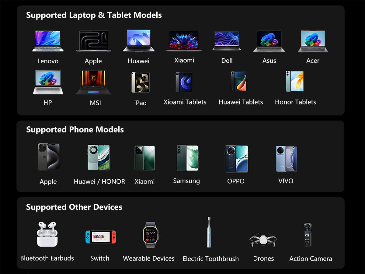 V laboratórnych podmienkach dokáže nabiť MacBook Air (M3) približne na 50 % alebo iPhone 17 Pro približne na 60 % za približne 30 minút. Skutočný čas nabíjania sa môže líšiť v závislosti od používania zariadenia a podmienok nabíjania.